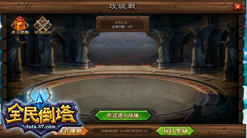 與DOTA智能5V5對戰(zhàn)不同,37《全民倒塔》將PK競技發(fā)展到了全服,特設(shè)大型群體PK玩法——攻城戰(zhàn)。這是一個大型行會據(jù)點爭奪的活動,讓不同公會的人進入城戰(zhàn)地圖,對皇城所有權(quán)進行爭奪,最終獲勝的行會會獲得豐厚的城池獎勵,同時公會的會長獲得城主的殊榮,可對下屬進行攻城官職分配。