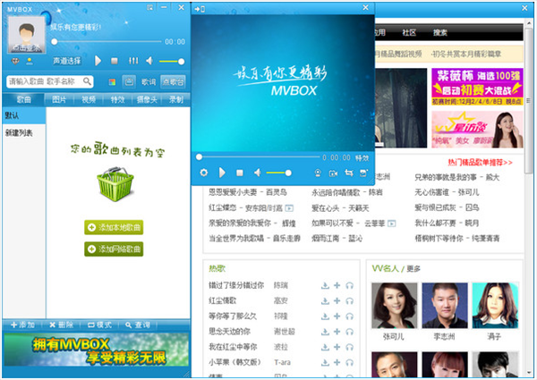 點(diǎn)歌臺(tái)窗口、列表窗口。點(diǎn)歌臺(tái)主要有歌曲和圖片、視頻等素材的搜索和下載功能主窗口是MVBOX操作和使用的主要界面列表窗口保存了當(dāng)前用戶已經(jīng)下載的歌曲、圖片和視頻等。