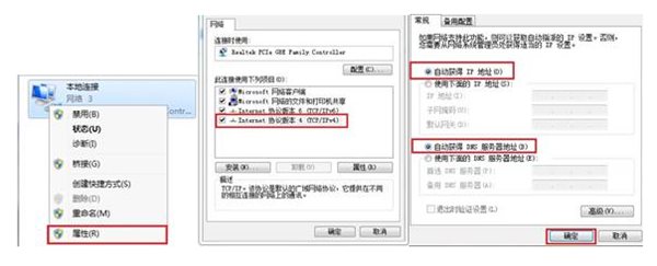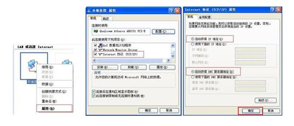 點(diǎn)擊“開始-控制面板-網(wǎng)絡(luò)和Internet-網(wǎng)絡(luò)和共享中心-更改適配器設(shè)置-本地連接”,右鍵單擊“本地連接”,選擇“屬性”。按照下圖的信息將本地連接的信息設(shè)置為“自動(dòng)獲得IP地址”和“自動(dòng)獲得DNS服務(wù)器地址”,設(shè)置完成之后點(diǎn)擊“確定”。