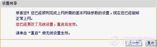設(shè)置完成后,單擊下一步,如果您更改了無線設(shè)置,將彈出如下圖所示的設(shè)置向?qū)瓿山缑?,單擊重啟使無線設(shè)置生效。