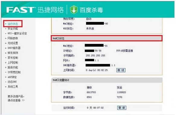 設(shè)置完成之后,刷新瀏覽器,瀏覽器界面會(huì)自動(dòng)跳轉(zhuǎn)至“運(yùn)行狀態(tài)”一欄。正常情況下可以看到“WAN口狀態(tài)”顯示后面有了具體的IP地址、子網(wǎng)掩碼、默認(rèn)網(wǎng)關(guān)等參數(shù)而不是0.0.0.0。如下圖所示,此時(shí)說明路由器已經(jīng)正常“連接”到互聯(lián)網(wǎng)了。