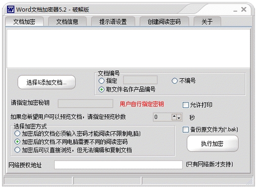 Word文檔加密器是通過(guò)加密使文檔不經(jīng)過(guò)允許非法傳播和未經(jīng)授權(quán)無(wú)法打開(kāi)!適合電子書(shū)和電子教程加密、課件加密!用戶無(wú)法提取文檔中的圖片和文字! 可以將doc打包成exe格式文件,用以加密DOC文件、RTF格式文檔,絕非office自帶的加密方法,本系統(tǒng)有以下特色----