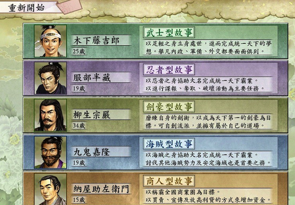 游戲的職業(yè)主要有4種武士、忍者、海賊、商人,武士主要是玩家加入各勢力并協(xié)助或者自己當(dāng)大名統(tǒng)一日本;忍者、海賊和商人與武士有相似的目標(biāo)要分別統(tǒng)一忍者里、水軍砦和商人司,但各有各的特色。忍者主要協(xié)助各大名家情報收集和破壞城池等各種危險的任務(wù),有其特殊的兵種忍者軍,還可以學(xué)習(xí)各種奧義秘技;海賊也是協(xié)助大名在海上的各種活動,但活動范圍受限,但也有特殊的兵種按船的大小分開船軍、大型船軍和鐵甲船軍;商人則是在經(jīng)濟(jì)上支持大名,為大名提供奉納金和鐵炮,沒有軍隊。
