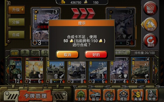 募兵到了靠譜的小伙伴,我們?cè)俅翁ど险鞒?。是不是用起?lái)相當(dāng)順手呢~在這里,小編還有個(gè)技巧要告訴大家~所有3星以上卡牌,都可以升級(jí)提升,前期賺到的**卡牌可以進(jìn)行碎片分解(卡牌升級(jí)免不了使用萬(wàn)能碎片),升級(jí)后簡(jiǎn)直