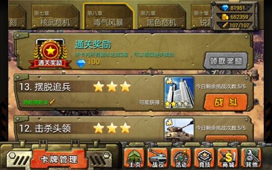 當(dāng)我們第一次打通一個(gè)章節(jié)后,我們就可以進(jìn)入下一章節(jié)繼續(xù)闖關(guān)。但是,打到某一關(guān)卡住了,打不過(guò)了怎么辦?也許大家都在拼命的向前沖,而就此錯(cuò)過(guò)了許多好風(fēng)景~~在《特種部隊(duì)TCG》中,每一章節(jié)其實(shí)是由隱藏任務(wù)的哦~達(dá)到隱藏條件,會(huì)有不少的好東西呢!