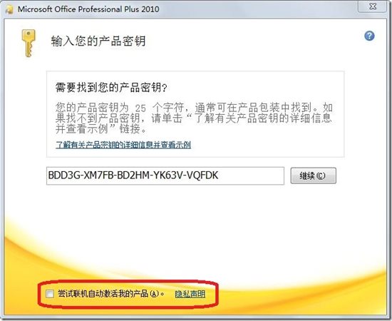 在方框中輸入密鑰,關于嘗試聯機激活,選擇或不選擇皆可,都已有激活的先例!輸入密鑰點擊 繼續(xù),直到安裝完成,然后啟動一個office組件,如果沒有彈出激活向導,那說明你的office 2010已經直接激活了,如果彈出激活向導,就需要按照下面的步驟激活了: