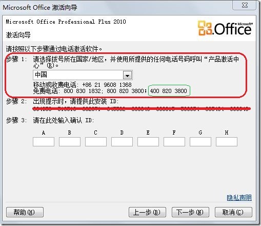 2、“下一步”后,在電話激活頁先選擇“中國”,然后撥打免費電話(推薦第三個:400 820 3800),