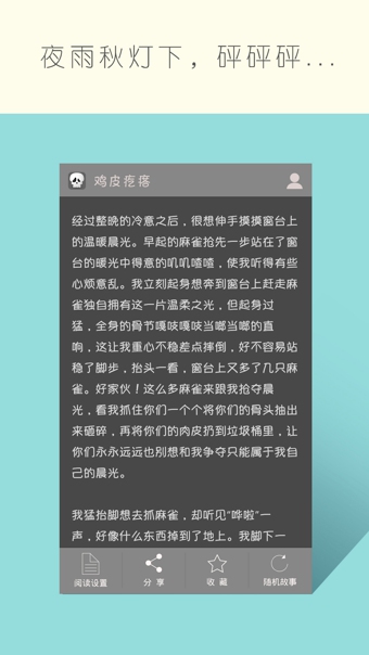 雞皮疙瘩app是一款非常小巧的資訊閱讀軟件。該閱讀軟件讀的可不是什么新聞大事,也不是什么美文,而是一篇篇恐怖的小說(shuō),故事集,是專門為喜歡看鬼故事的朋友打造的,膽小者勿入。