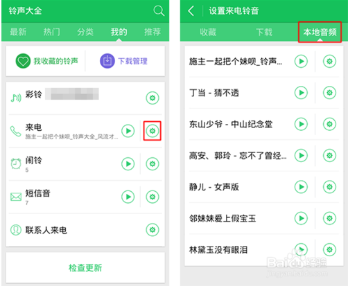假如要從鈴聲大全設(shè)置本地音樂(lè)為鈴聲,那么可以點(diǎn)擊【 我的—>來(lái)電—>本地音頻 】此時(shí)即會(huì)自動(dòng)掃描,識(shí)別出您手機(jī)內(nèi)存卡中的MP3文件了。