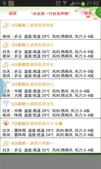 4)可以到點(diǎn)播報(bào)天氣預(yù)報(bào)內(nèi)容。