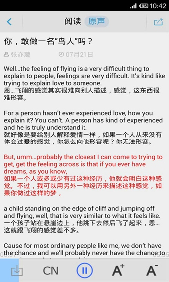 原聲聽(tīng)力:海量資源,精挑細(xì)選;對(duì)照翻譯,同步定位,感受英語(yǔ)國(guó)家風(fēng)情,體驗(yàn)純正英語(yǔ)口語(yǔ);