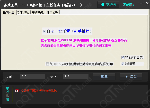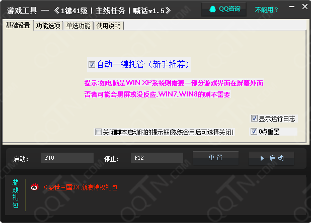 盛世三國2升級輔助是盛世三國游戲中的一款升級輔助工具。該工具僅支持win7系統(tǒng),它具有一鍵主線、一鍵日常的功能,還能讓游戲中的人物死亡后自動復(fù)活。
