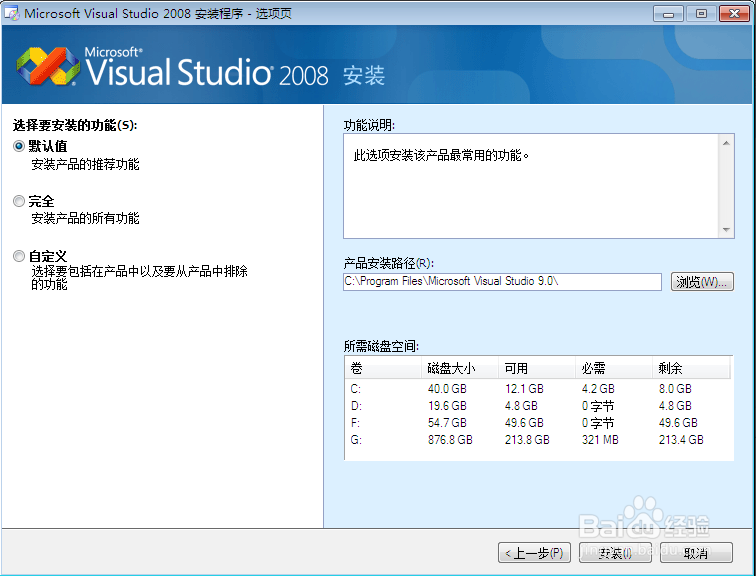 選擇安裝我功能“默認(rèn)、完全、自定義”,可直接選擇默認(rèn)值;