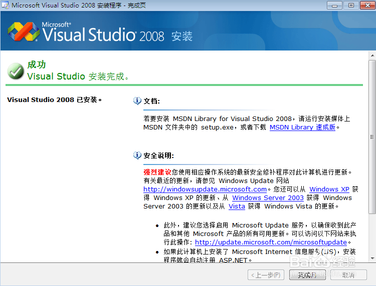 安裝完畢后,單擊“下一步”進(jìn)入安裝完成提示界面,此時單擊“完成”即完成了Vs2008的安裝。