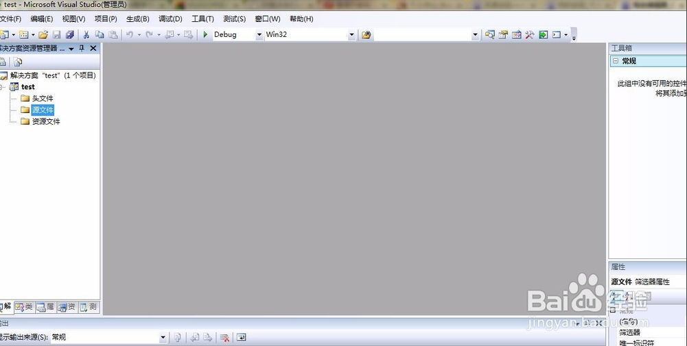 完成上步驟之后,點(diǎn)擊完成,進(jìn)入如下界面,一個新建的項目工程界面,從界面的右側(cè)工程欄里我們可以看到頭文件,源文件等文件夾。