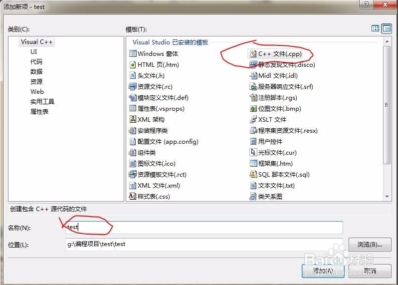 選擇文件類型C++ File (.cpp),輸入文件名(注意:c文件需要加.c后綴),然后點(diǎn)擊添加(Add)