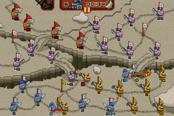 《權(quán)利的抽風 Twitchy Thrones》是一款像素風的策略游戲,較為簡單復古的畫面反而更增添了史詩感,戰(zhàn)斗會以即時戰(zhàn)斗的形式進行操作,敵我雙方甚至三方的軍隊會在一個小小的棋盤中進行戰(zhàn)斗,棋盤中的路線犬牙交錯,玩家需要拖動我方的士兵侵入地方的據(jù)點與敵軍進行交戰(zhàn),將之消滅后就可以將該劇點占領,而每一個所占領的據(jù)點會每十秒生存兩名士兵。