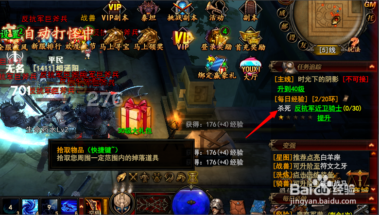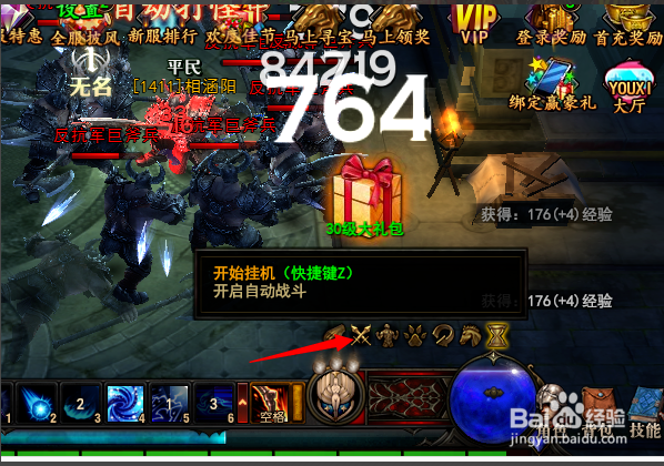 當(dāng)你到39級之后就要自己去完成每日任務(wù)升級之類的,這給你介紹第一個小技巧——掛機??吹酵局械奈淦鞑孀樱c擊掛機就會自動刷怪,省不少麻煩。當(dāng)然,你自己想動手操作也是可以的。
