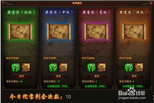 野外打怪以及副本boss都可以掉落藏寶圖,找到藏寶圖上的寶藏就有機會獲得海量經(jīng)驗和金幣。藏寶圖可以合成,等級越高的藏寶圖獎勵也就越豐富。