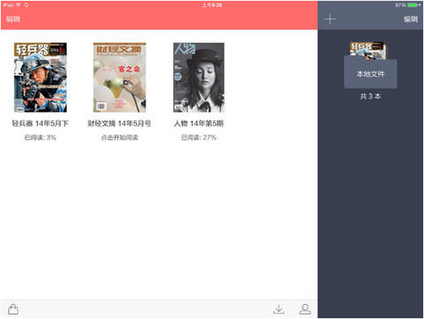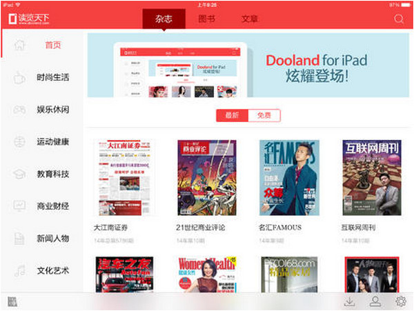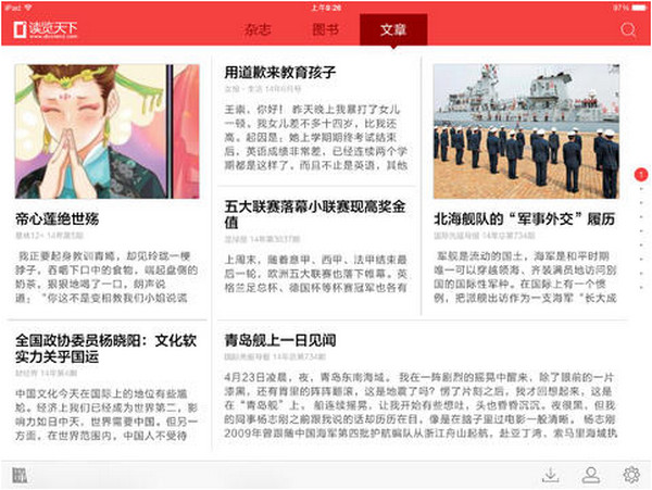 支持下載離線閱讀,書架管理功能方便查找,快速下載功能節(jié)省等待時(shí)間,畫面清晰度高,頁面可隨需求縮小或放大,翻頁順暢讓用戶有更好的閱讀享受。本軟件操作簡單容易上手。讀覽天下, iPad里的報(bào)刊亭。