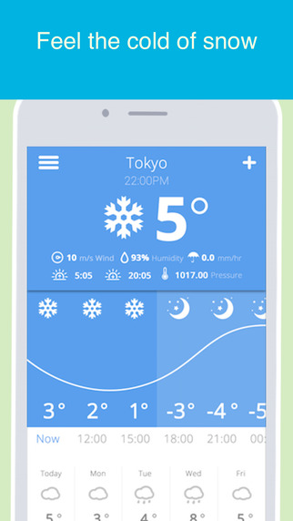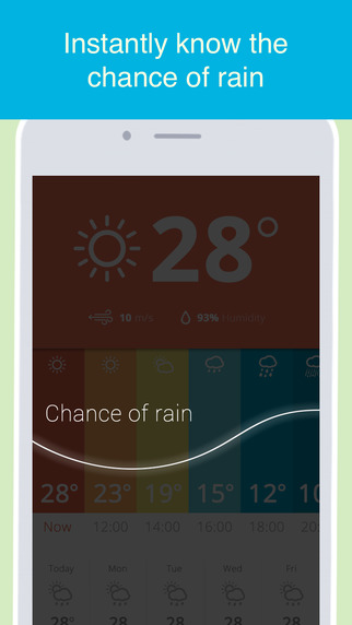Weather Glance功能特別簡單,采用了不同的色塊來代表不同的天溫度,冷色調(diào)表示寒冷,暖色調(diào)表示溫暖,在時段預(yù)報圖上采用曲線來標注下雨的可能性,所以用戶只需稍微看一眼就能夠了解到天氣的走向。