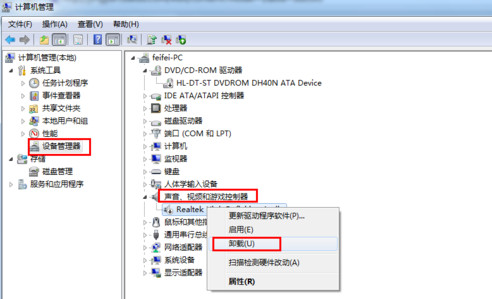 然后找到設(shè)備管理器,找到聲音、視頻和游戲控制器然后你再點擊卸載