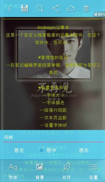 andream記事本下載是一款非常實用的記事本軟件。該軟件小巧,不占內存,并且實用簡單,非常容易上手。它的字體、背景可隨用戶隨意切換,并且還有動畫效果。
