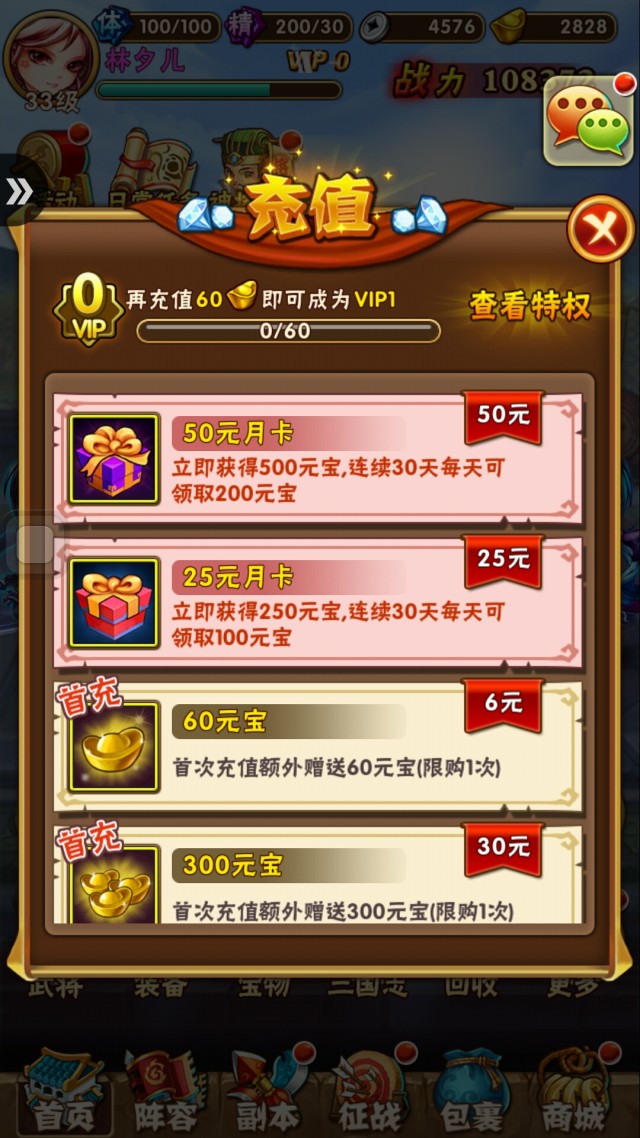 4、充值問題:開始可以買雙月卡,雙月卡非常實惠,后期可持續(xù)發(fā)展啊。同時,建議能充100的就充100,能拿3件紫裝,總計2把紫武器,1件衣服,推副本快??!而且,還有橙魂噢,必定開出一個橙將,還能拿到集市里禮包的V0-V3精彩內(nèi)容。