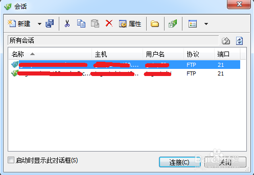 3、回到Xftp主窗口在”新建“按鈕右側(cè)有一個文件樣式的圖標為”打開“按鈕,點擊該按鈕,在彈出的小窗口中選擇剛剛新建的主機,雙擊就連接到FTP服務(wù)器上面了。