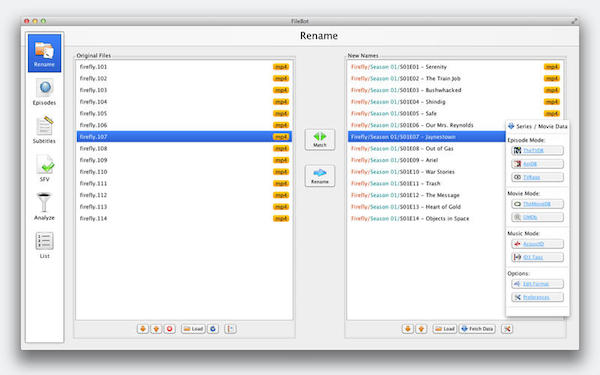 1、自動(dòng)命名FileBot從各種在線數(shù)據(jù)庫檢索文件的信息,但留出了空間,為您管理文件命名,你怎么樣使用常規(guī)表達(dá)式。