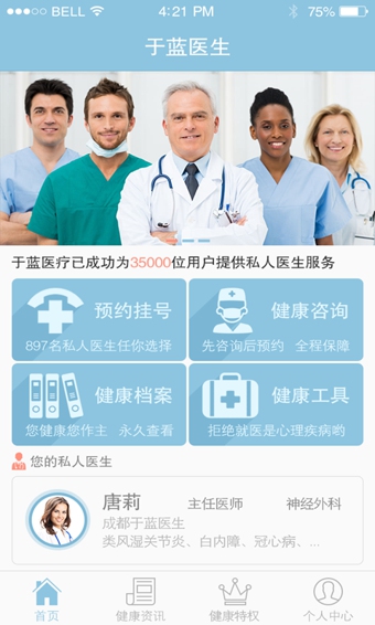 于藍醫(yī)生,隸屬于成都于藍健康管理咨詢有限公司,專注于為廣大患者提供便捷的私人醫(yī)生健康服務,幫助患者掌握健康資訊、預防預測疾病、優(yōu)化就醫(yī)過程、提高生活質量,將醫(yī)院、醫(yī)生、患者多方融洽的結合,建立了私人醫(yī)生健康服務平臺,讓患者能夠得到專業(yè)系統、及時有效的整體健康維護。