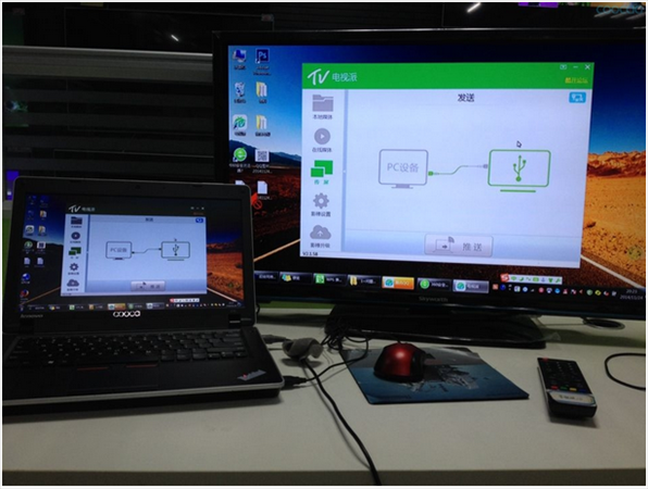 傳屏,鼠標(biāo)點(diǎn)擊傳屏功能后,界面切換到傳屏界面。直接點(diǎn)擊“推送”就可以把電腦的整個(gè)桌面推送到影棒顯示設(shè)備端上。