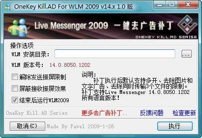 WLM(MSN Live Messenger)2009 去廣告補(bǔ)丁 V1.0 簡體中文綠色免費版 這個補(bǔ)丁目前僅支持Live Messenger 2009 v14.0.8050.1202,支持所有語言環(huán)境。