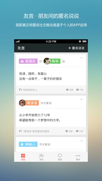 友言app是一款非常受年輕人歡迎的垂直于人際的匿名社交應(yīng)用,用戶可以在這里暢所欲言,說出你想說的心里話,每一句鼓勵對于網(wǎng)友來說都是增進(jìn)溝通的方式。