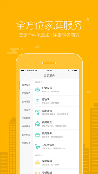 家居保養(yǎng):地板打蠟、皮質(zhì)沙發(fā)保養(yǎng)、廚房保養(yǎng)等。