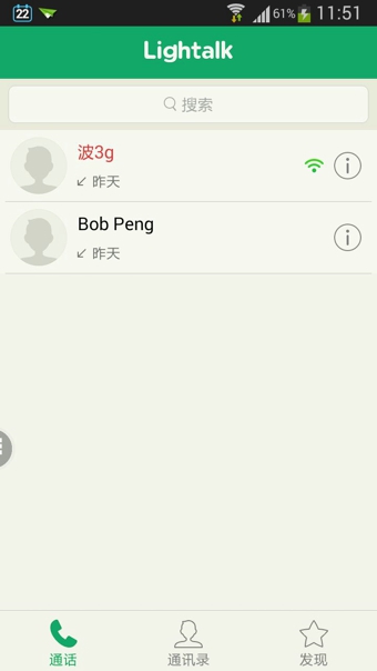 騰訊來電 Lightalk是由騰訊公司出品的一款語音社交應用,以語音通話、視頻通話等實時溝通方式為核心的一個社交App。手機號碼作為帳號,關系鏈上主要是以手機的系統(tǒng)通訊錄為基礎,同時可以導入QQ等其他產(chǎn)品的關系鏈作為補充。目前支持雙人語音、多人語音、雙人視頻、語音消息、DA(一種簡單的溝通方式)等功能。【軟件特點】