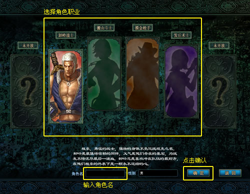 根據(jù)個(gè)人喜好,選擇適合自己的職業(yè)。目前游戲中有四種職業(yè)供選。建立角色時(shí)需要輸入游戲中的昵稱。點(diǎn)擊確定,角色創(chuàng)建成功