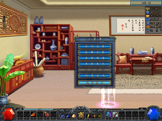 7、主菜單界面按鈕:點(diǎn)擊后進(jìn)入“主菜單界面”。可以進(jìn)行多項(xiàng)系統(tǒng)設(shè)置,進(jìn)行重新登陸、結(jié)束游戲等操作。注意:屏幕分辨率和屏幕刷新率兩項(xiàng)設(shè)置需要重新啟動(dòng)客戶端才可以生效