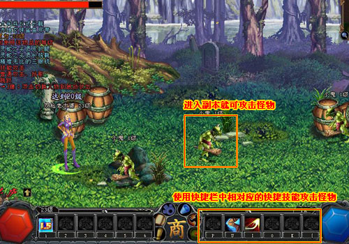 二、進(jìn)入副本地圖后,便可以開(kāi)始攻擊怪物。在攻擊的時(shí)候也可以使用快捷鍵或者使用快捷欄中相對(duì)應(yīng)的快捷技能開(kāi)攻擊怪物