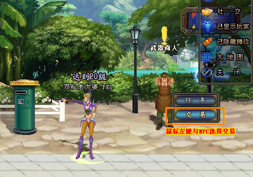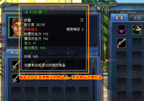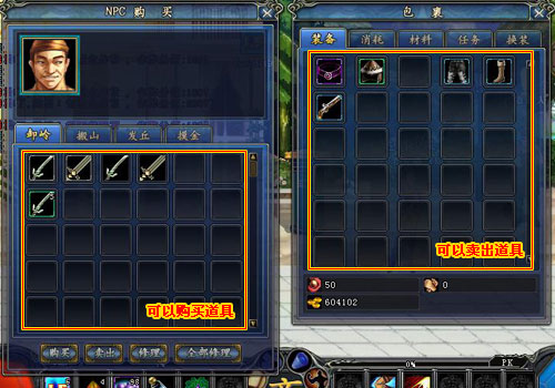 2、鼠標(biāo)左鍵與NPC選擇交易之后,便打開(kāi)了買賣的界面,可以買進(jìn)或賣出道具。