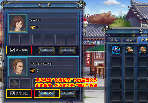5、雙方點(diǎn)選“鎖定物品”鎖定需要交易的物品后,雙方都選擇“確定”按鈕,交易成功。