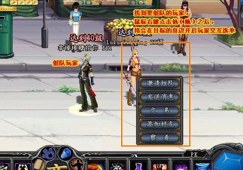 1、點(diǎn)擊需要交易的玩家,鼠標(biāo)右鍵點(diǎn)擊他(她)之后,將會(huì)在目標(biāo)的身邊開(kāi)啟玩家交 互選單