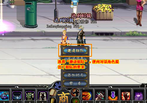 二、在玩家交互界面里,選擇“邀請(qǐng)組隊(duì)”,便向?qū)υ捊巧岢隽私M隊(duì)的要求