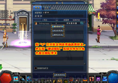 三、除了以上的辦法,也可以直接按“U”打開(kāi)好友列表界面選擇好友,然后按“邀請(qǐng)組隊(duì)”按鈕可向?qū)Ψ浇巧岢鼋M隊(duì)要求。