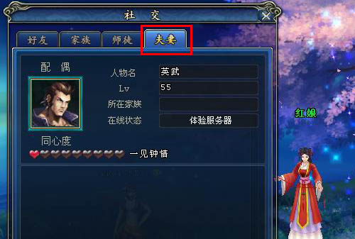 你可以通過(guò)選擇“社交”中的”夫妻”按鈕來(lái)看看你的配偶,如圖: