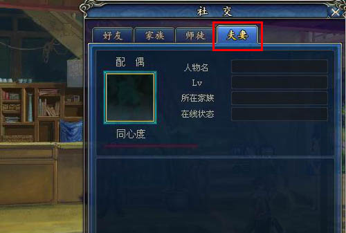 離婚成功后,系統(tǒng)“社交”中的”夫妻”按鈕將清空夫妻信息,如圖: