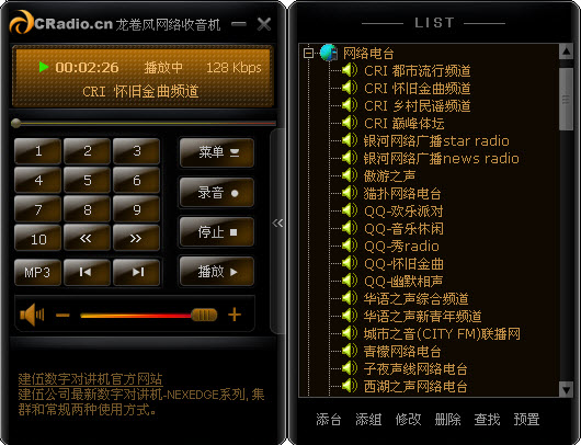 考慮到在線更新時會覆蓋原來的數(shù)據(jù),內(nèi)置電臺數(shù)據(jù)只能瀏覽不能修改。您可以手工添加、編輯電臺數(shù)據(jù)。不能編輯的內(nèi)置電臺組有:“編者推薦”、“流派分類”、“地域分類”、“綜合分類”、“網(wǎng)絡(luò)電臺”。