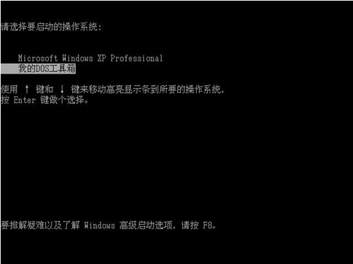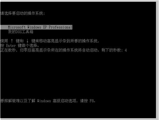 在6秒內(nèi)如不進(jìn)行選擇會(huì)自動(dòng)啟動(dòng)進(jìn)入默認(rèn)的操作系統(tǒng)(XP)。要啟動(dòng)矮人DOS工具箱 請(qǐng)?jiān)?秒內(nèi)按方向鍵“↓”選擇“我的DOS工具箱”