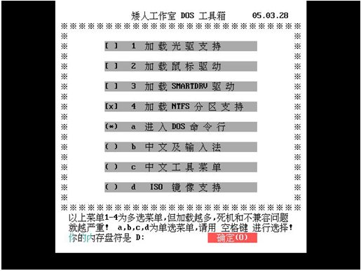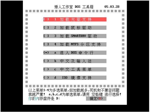 選定了需要加載的項(xiàng)目以后,然后按"↓"方向鍵選擇"確定"按鈕再按回車鍵就可以啟動(dòng)dos并加載相應(yīng)選項(xiàng)支持。