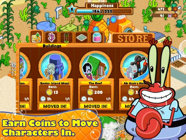 SpongeBob Moves In《海綿寶寶搬來了》是一款以動畫片《海綿寶寶》為背景的模擬養(yǎng)成游戲,由Nickelodeon電視臺正版授權,游戲講述的是海綿寶寶首次搬到了比奇堡,人生地不熟,你要幫助他認識鎮(zhèn)上的每個朋友,還要幫他在蟹堡王找到工作,除此之外,你還可以和蟹老板、珊迪、派大星和章魚哥他們一起游戲哦!最讓人驚喜的是,動畫片配音演員傾情為這款游戲配音,你能體驗到最原汁原味的《海綿寶寶》!